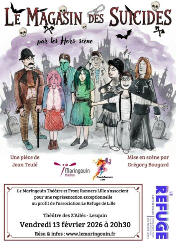 Le Maringouin Théâtre et Front Runners Lille s’associent pour une soirée exceptionnelle au profit de l’association Le Refuge de Lille. Le Refuge vient en aide à des jeunes de 18 à 25 ans, victimes d’homophobie, de transphobie ou encore de mal-être dû à leur orientation sexuelle. Une mise à l’abri dans des appartements relais et un accompagnement social et psychologique sont proposés aux jeunes exclus du domicile familial.